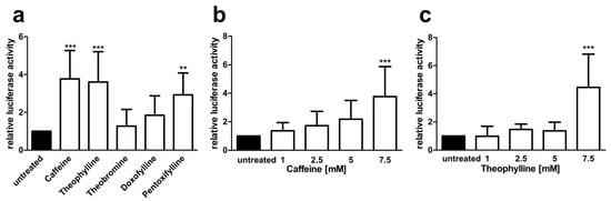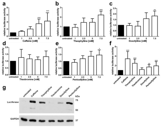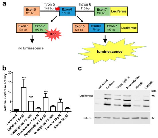 Significant increase of luciferase signal was detected with 7.5 mM caffeine, theophylline, pentoxifylline, and with 25 µM luteolin (Figure 11b). Luciferase expression was verified by Western blot (Figure 11c) and was in accordance with the activity readouts from Figure 11b.