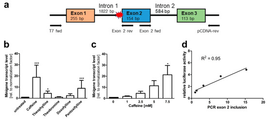 AGA minigene qRT-PCR splicing assay in HEK293T cells. (a) The AGA minigene construct without firefly luciferase, the qRT-PCR primers for detecting exon 2 inclusion are shown with arrows. (b,c) HEK293T cells were transfected with the minigene construct and treated with (b) 7.5 mM of the substances or (c) increasing doses of caffeine for 24 h. Total RNA was isolated, reversely transcribed and analyzed by qRT-PCR. Bars represent the mean ± SD of three independent experiments. Statistical analysis by one-way ANOVA against the untreated samples. Values of p < 0.05 were considered significant (*) while values of p < 0.001 were considered extremely significant (***). (d) The caffeine effect from luciferase assay (shown in Figure 5a) was correlated with the caffeine effect in the qRT-PCR assay shown in (c).