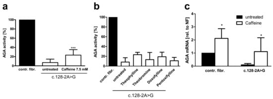 Effect of xanthine derivatives on the AGA activity and AGA mRNA level in AGU fibroblasts. Patient fibroblasts were treated for 48 h with 7.5 mM caffeine (a) or other methylxanthines (b), and the AGA activity was measured; n = 4, graphs show the mean ± SD. Statistical analysis by one-way ANOVA. (c) Patient and control fibroblasts were treated with 7.5 mM caffeine for 24 h. AGA transcript level was measured with qPCR using primers for exons 2 and 3, n = 6, two-way ANOVA. Values of p < 0.05 were considered significant (*)and p < 0.001 extremely significant (***).