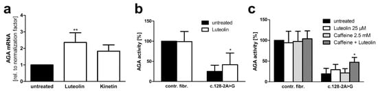 Luteolin treatment increases AGA mRNA amount and AGA activity in c.128-2A>G AGU patient fibroblasts. (a) Quantitative real-time PCR of AGA mRNA with patient fibroblasts with c.128-2A>G variant after treatment with luteolin (25 µM) or kinetin (50 µM) for 24 h. AGA was detected with the primers specific for exons 2 and 3. Bars represent the mean ± SD of three independent experiments, one-way ANOVA against the untreated sample. (b) Treatment of fibroblasts with luteolin (25 µM) for 48 h and measurement of AGA activity with AADG as substrate, 13 independent experiments, two-way ANOVA against the untreated sample. (c) Control and patient fibroblasts were treated with suboptimal amounts of caffeine (2.5 mM) to prevent mRNA degradation, either alone or in combination with luteolin (25 µM) for 48 h. AGA activity was measured as in (b), three independent experiments, one-way ANOVA against the untreated sample. Values of p < 0.05 were considered significant (*) while values of p < 0.01 were considered very significant (**).