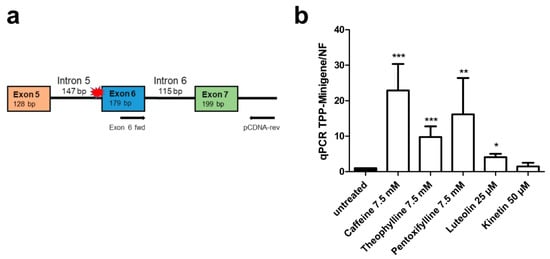 Analogously to our approach with the AGA splicing assay, we also constructed a TPP1 minigene without luciferase to demonstrate the presence of exon 6 and correction of splicing upon treatment with caffeine, theophylline, pentoxifylline, luteolin and kinetin by qRT-PCR (Figure 12a). In accordance with the luciferase assay, significantly increased inclusion of exon 6 was observed after caffeine, theophylline, pentoxifylline, and luteolin treatment, whereas kinetin did not increase exon 6 inclusion (Figure 12b). Examples of the quality control data for the qPCR experiments are provided in Supplementary Figure S6, and the sequence of the amplicon, showing the correct joining of exons 6 and 7, is shown in Supplementary Figure S7.