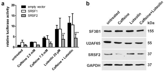 The members of the serine and arginine rich splicing factor (SRSF) family are important components of the splicing machinery. Splicing factors of the SRSF protein family, such as SRSF2 (also called SC35), bind to exonic splicing enhancers (ESE) and are able to modulate splicing by regulation of the spliceosome assembly (for review, see [32,33]). Therefore, we tested if overexpression of Strep-tagged SRSF1 and SRSF2 could improve the splicing of the AGA-luciferase minigene (Figure 13a). HEK293T cells were transfected with the respective expression plasmids, treated with caffeine (2.5 mM or 7.5 mM), luteolin (25 µM), or a combination thereof (Figure 13a, verification of the expression of SRSF proteins in Supplementary Figure S8). While the treatment with the substances resulted in an increased luciferase activity, indicating enhanced correct splicing, SRSF overexpression did not enhance the splicing further. Interestingly, overexpression of SRSF2 caused a lower luciferase activity in treated cells, indicating an inhibitory effect (Figure 13a). Furthermore, overexpression of SRSF1 appeared to enhance cryptic splicing of intron 1 upon luteolin treatment, since 23 nucleotides from the 3′ end of intron 1 were frequently found in the sequenced minigene splicing product (Supplementary Figure S8).