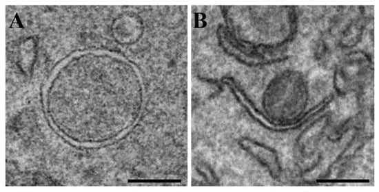 Transmission electron microscopic images of autophagosome (A) and isolation membrane (B). Neuro-2a (N2a) cells were starved in EBSS for 2 h. Scale bars, 200 nm.
