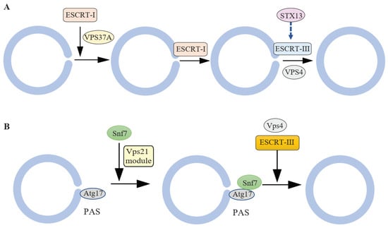 The ESCRT-III subunit Snf7 (CHMP4 in mammals) interacts with Atg17 (FIP200 in mammals) and leads to the recruitment of ESCRT to IMs. This process is essential for autophagosome closure, and it is dependent on Rab GTPase Vps21 (RAB5) [19,20]. The endocytic Vps21 GTPase module including the Rab GTPase Vps21, the GEF Vps9, the CORVET tethering complex subunit Vps8, and SNARE protein Pep12 is required for autophagosome closure in budding yeast [29]. The deletion of these genes results in the accumulation of unsealed autophagosomes without affecting the formation of Atg8–PE and IM elongation [29].