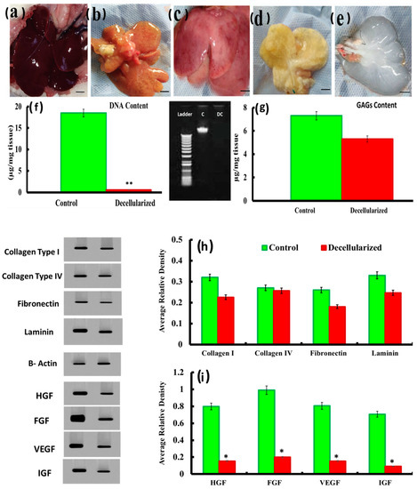 Representative images of livers during decellularization process at (a): 0 h; (b): 18 h;(c): 48 h; (d) 72 h, and (e): 96 h. (f): DNA content analysis; (g): glycosaminoglycans (GAGs) analysis of normal liver compared to decellularized (DC) rat liver scaffold; (h,i): Western blot assay for ECM components & growth factors of normal liver and after decellularization process. β-actin was used as housekeeping protein and quantification was performed using Image analysis software on the Chemi Doc MP imaging system. Superscripts (*) indicate significant differences at p ˂ 0.05. Superscript (**) indicates significant differences at p ˂ 0.01. Data are shown as mean ± S.E.M, n = 7.