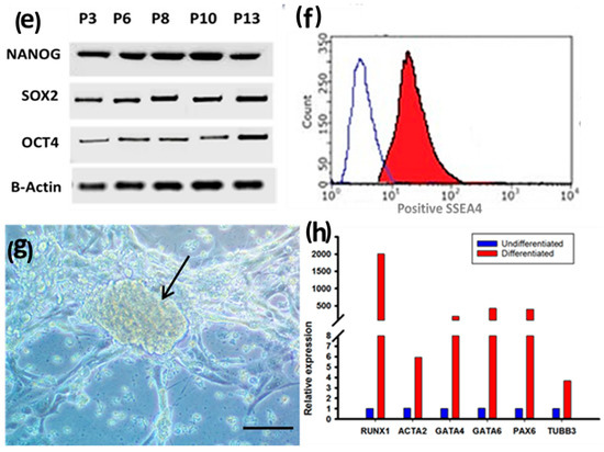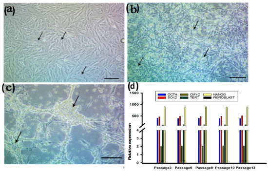 Remarkably, 24 h after the reprogramming process, dermal fibroblasts exhibited marked morphological changes, from the initial spindle-shape to a more polygonal or epithelial-like cells morphology until confluence was reached after 7−10 days (Figure 2a,b). Three to six weeks after reprogramming colonies showing a typical iPSCs morphology appeared in culture (large nuclear to cytoplasmic ratio, and form domed colonies (Figure 2c). Based on colonies morphology, the calculated reprogramming efficiency was 0.95%. Fragments of ESC-like colonies after picking were able to form new colonies (clones). Furthermore, PCR analysis was performed to confirm the induction of endogenous pluripotency-associated markers including OCT4, SOX2, NANOG, TERT, and c-MYC. The markers of pluripotency remained unchanged from passages 3 to 13 (Figure 2d), suggesting the maintenance of an undifferentiated state of the iPSCs clones produced, thus confirming the stability of the clones. Embryoid formation was detected and characterization of three germ layers (endoderm, ectoderm, and mesoderm) via detection of gene expression of ectoderm (GATA4 & GATA6), mesoderm (RUNX1 & ACTA2), and endoderm (TUBB3 & PAX6) was performed. These markers were assessed by RT-PCR (Figure 2h).