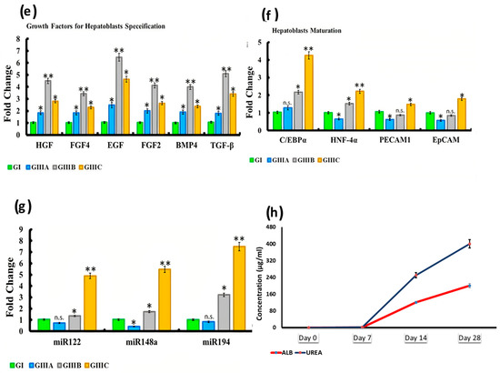To evaluate extent of growth factors expression in various stages of liver maturation, expression of HGF, FGF4, EGF, FGF2, BMP4, and TGF-β was assessed. As displayed in Figure 3e, the aforementioned growth factors showed significant upregulation across groups IIIa, IIIb, and IIIc, and to the greatest extent in group IIIb.