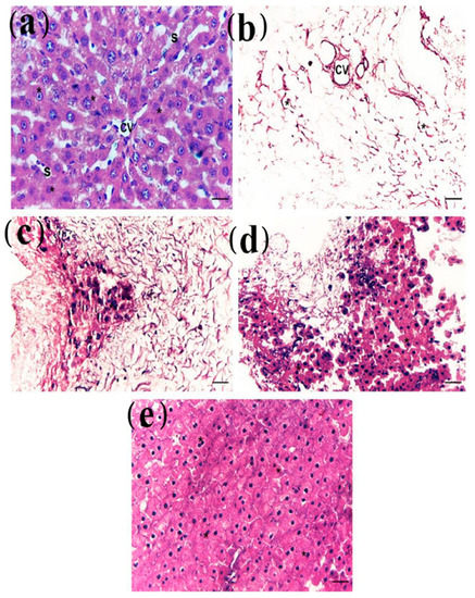 Photomicrograph of a section in normal liver, decellularized scaffolds as well as recellularized scaffold 4, 14, and 24 days after iPSCs cell seeding showed (a): group I (control group) showed cords of normal hepatocytes radiating from a central vein (CV), hepatocytes (*) are cubical with a large central basophilic nucleus and blood sinusoids (S); (b): group II (decellularized group) showed no visible cell nuclei and cellular material (*) in all decellularized livers; (c): group IIIa (recellularized group after 4 days): showed a minimal distribution of cellular engraftment (*) across the scaffold at day 4; (d): group IIIb (recellularized group after two weeks): showed a moderate distribution of cellular engraftment (*) across the scaffold at day 14; (e): group IIIc (recellularized group after 24 days): showed complete cell sheets (*) forming colonies resembling hepatocytes.