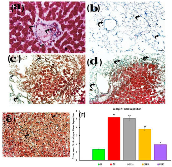 A photomicrograph of Masson’s trichrome stained sections in normal liver, decellularized scaffolds as well as recellularized scaffold 4, 14 and 24 days after iPS cell seeding showed (a): group I (control group) showed minimal collagen fibers accumulation (curved arrow) around portal tract; (b): group II (decellularized group) showed preserved collagen fibers (curved arrow) as well as the portal and lobular connective tissue structure in decellularized liver scaffolds; (c): group IIIa (recellularized group after 4 days) showed marked collagen fibers (curved arrow) with minimal amount of cell colony (*); (d): group IIIb (recellularized group after 14 days) showed moderate collagen fibers (curved arrow) with moderate amount of cell colony (*); (e): group IIIc (recellularized group after 24 days) showed minimal collagen fibers (curved arrow) with extensive amount of cell colony forming sheets of hepatocytes (*); (f): A histogram represents the mean area percentage of collagen in all experimental groups. The significant differences against the control group indicated by a * for p < 0.05 and a ** for p < 0.01. Data are shown as mean ± S.E.M, n = 7.