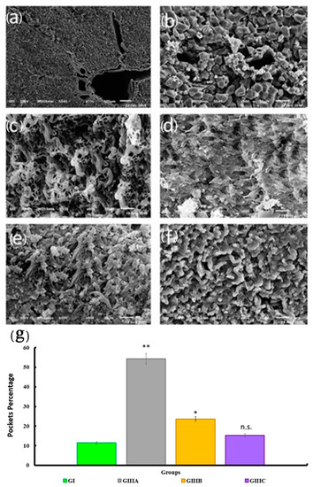 Normal liver revealed segmented liver parenchyma with regular interdigitating portal tracts and hepatic veins with a branching structure. Hepatocellular plates appeared polyhedral with multifaceted hepatocytes forming distinct one-cell thick plates (laminae). Plates were continuous excepting holes for sinusoidal penetration (lacunae). Neighboring plates were separated by sinusoids (Figure 7a,b). Decellularized livers, in confirmation of above, displayed a complete absence of cells with remaining scaffolds consisting of a three-dimensional network of connective tissue fibers arranged in a honeycomb-like structure (Figure 7c). In recellularized groups, there was a gradual increase in cell density and reduction of hepatocyte pockets ultimately forming cells sheets that covered all collagen bundles (Figure 7d–f). Quantification of pockets showed significant increases in groups IIIa and IIIb when compared to the control group (native liver) indicating decreased cell density. Group IIIc, consistent with Masson’s Trichrome results, showed no significant difference when compared to the control group (Figure 7g).
