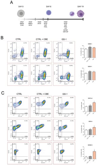 After the generation and characterization of CTRL and GD type 1 patient iPSC (Figure S1A–C), they were amplified and subsequently differentiated into hematopoietic precursors and monocyte/macrophage cells through a 2D coculture system on matrix (Figure 1A). From day 9 of the differentiation protocol, CTRL cells were treated with CBE 250 µM to inhibit GCase enzyme and obtain a GD-like condition (Figure S1D). The supernatant containing the hematopoietic precursors cells emerged from the underlying stroma was collected and lineage specific markers were tested through flow cytometry starting from day 9 of differentiation. CTRL cells, either untreated or treated with CBE, and GD-1 lines were all able to give rise to CD34+/CD45+ hematopoietic progenitor cells, as well as myeloid precursor CD45+/CD33+ (Figure 1B). After 10 other days in culture under specific cytokine stimuli, cells acquired the mature monocyte lineage markers CD11b, CD14 and partially also the mature macrophage marker CD163. Interestingly, GD-1 line expressed significantly higher levels of all the analyzed markers if compared with the CTRL. The same trend, even if not significant, emerged also analyzing cells treated with CBE (Figure 1C) suggesting that GCase deficit may enhance the myeloid differentiation efficiency, with a higher production of monocyte/macrophage cells.