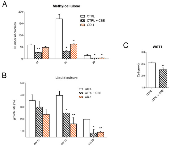 iPSC-derived monocyte/macrophage cells display a decreased cell growth rate. (A) Number of the colonies of CD45+ cells seeded in semi-solid culture condition represented as mean with SEM (n = 3 independent experiments). Cells were seeded and replated every 6 days for three times (p1, p2, p3). CBE 250 µM was added to CTRL cells at every replating. (B) Count of the iPSC-derived monocyte/macrophages growth rate seeded in liquid culture with VEGF 50 ng/µL, bFGF 50 ng/µL, SCF 50 ng/µL, Flt3L 5 ng/µL, IL3 25 ng/µL, M-CSF 50 ng/µL, GM-CSF 25 ng/µL. For CTRL + CBE condition, CBE 250 µM was added to the medium at every cell passage. Graphs represent mean with SEM (n = 3). (C) Measurement of cell proliferation with the WST1 reagent of CTRL and CTRL treated with CBE iPSC-derived monocyte/macrophages after 19 days of differentiation. Histograms represents mean with SEM. Statistical significance is indicated (Student’s t-test), * p < 0.05, ** p < 0.01.