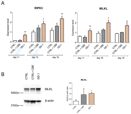 RIPK3 and MLKL are upregulated in GD iPSC-derived monocyte/macrophages. (A) Expression levels of RIPK3 and MLKL genes in iPSC-derived CTRL and GD lines at different time points during macrophage differentiation (day 11, 15 and 19). Expression levels are normalized with respect to three housekeeping genes. Graphs represent mean with SEM, n = 3. (B) Protein level of MLKL with the relative quantification, n = 2. Statistical significance is indicated (Student’s t-test), * p < 0.05, ** p < 0.01.
