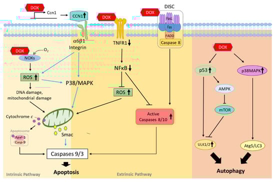 Mechanisms of doxorubicin implicated in chemotherapy-associated cardiotoxicity. Major doxorubicin-induced damages are caused through apoptosis and autophagy pathway. In apoptosis, doxorubicin affects apoptosis-related factors both in the intrinsic and extrinsic pathways. In autophagy, doxorubicin induces the activity of upstream modulators and triggers autophagy. Doxorubicin is represented as a red hexagon (DOX). Other factors are shown as colored ovals and rectangles.