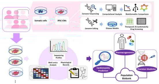The advancement of genetic analysis and modification techniques have paved the way for more precise study of the interactions between genetic variants, responses to chemotherapy, and cardiotoxicity consequences. Patient-derived iPSC-CMs are an excellent source of unique and personalized genomes that can now be meaningfully used to explore genetic associations in cardiotoxicity [] (Figure 3).