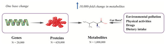 Multiple factors contribute to the development of diabetes. Most genetic variants associated with T2D identified in large genome-wide association studies (GWAS) only modestly contribute to the risk of diabetes. Among the identified genetic variants, over 300 common genetic variants collectively explained only 16% of the variance of diabetes in a study which included around one million individuals of European decent [19]. Metabolites are, in general, the downstream products of gene expression, transcripts, protein transporters, and enzymatic reactions, which are closely correlated with genes in which a single deoxyribonucleic acid (DNA) base change in a given gene can result in 10,000-fold change in the level of endogenous metabolites [20] (Figure 1). Besides internal variations, metabolites can also be affected by exogenous factors, such as diet, lifestyle, physical activities, gut microbiota, and environmental pollution; thus, the metabolome is believed to reflect the molecular profile most proximal to an individual’s phenotype, since it integrates information from the genome, transcriptome, proteome, and enzymes as well as exogenous exposures (Figure 1).