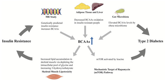 BCAAs (isoleucine, leucine, and valine) have been found to be altered among obese vs. lean humans, and were found to contribute to insulin resistance in experimental studies [67]. First reported in the Framingham Heart Study (FHS) and subsequently replicated in the Malmö Diet and Cancer study [38], BCAAs and two aromatic amino acids (AAAs, tyrosine and phenylalanine) were found to be associated with increased risk of T2D during a 12-year follow-up, and the associations remained significant after adjustment for age, sex, body-mass index (BMI), and fasting glucose [38]. The combination of three amino acids (isoleucine, tyrosine, and phenylalanine) could predict T2D (odds ratio [OR] 2.42, 95% confidence interval [CI] 1.66–3.54). Furthermore, compared to individuals from the lowest quartile, people in the highest quartile had an odds ratio of 5.99 (95% CI, 2.34–15.34) for diabetes [38]. Multiple studies across different ethnicities have since replicated the association between BCAAs and risk of diabetes [39,45,47,51,52,53,54,57,59,60]. BCAAs have been found to be related to insulin resistance in animal and human studies [68], however, it remains unclear whether BCAAs contribute to diabetes in a causal manner. Residual confounding and reverse causation in observational studies often hamper the causal inference between biomarkers and outcomes. Using genetic variants mimicking the life-time effects of an environmental exposure which are fixed at conception as the instrumental variable, Mendelian randomization (MR) studies have been utilized to explore the potential causal link between exposures and outcomes. One MR study found that a GRS (genetic risk score) for insulin resistance causally increased BCAAs levels, while genetically increased BCAAs were not associated with insulin resistance [69]. Another two-sample MR study further supported a causal link between insulin resistance and BCAAs [70]. Despite lacking a direct causal link with diabetes, these results suggest that BCAAs may lie on the causal pathway from insulin resistance to diabetes by mediating the effect of insulin resistance on the development of diabetes, since BCAAs levels have been found to be increased by obese microbiomes, and there is decreased oxidation in the adipose tissue and liver in people with insulin resistance [71] (Figure 2). BCAAs may therefore serve as predictive biomarkers, especially given their levels may be increased as early as a decade before overt diabetes.