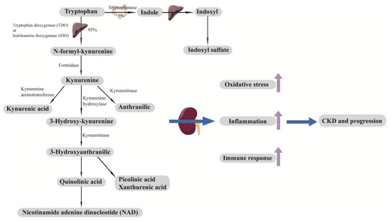 Tryptophan metabolic pathway and development and progression of CKD. Tryptophan is an essential amino acid that cannot be synthesized in the body. A minor fraction of tryptophan (<5%) is metabolized by the indole pathway to produce indoxyl sulfate. Most tryptophan (around 95%) is metabolized by the kynurenine pathway. Downstream metabolites of tryptophan, including indoxyl sulfate, kynurenic acid, picolinic acid, xanthurenic acid, quinolinic acid, and NAD, contribute to oxidative stress, inflammation, and immune response, which lead to the development and progression of CKD. CKD, chronic kidney disease; NAD, nicotinamide adenine dinucleotide.