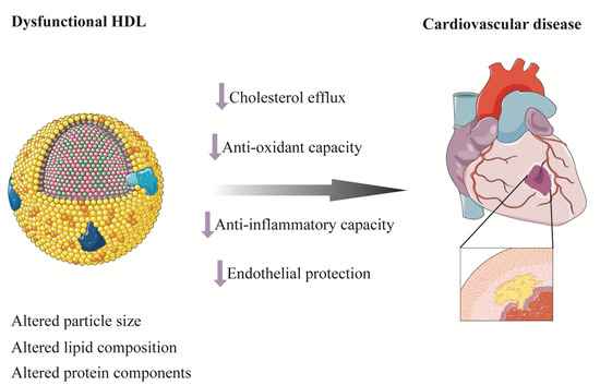 Dysfunctional HDL and cardiovascular disease. HDL are highly heterogeneous in size, structure, composition, and function. Altered lipid composition, protein components, and sizes result in dysfunctional HDL. Decreased cholesterol efflux from macrophages, antioxidant and anti-inflammatory capacity, and endothelial protective function of HDL induce atherosclerosis and cardiovascular disease. HDL, high-density lipoprotein.