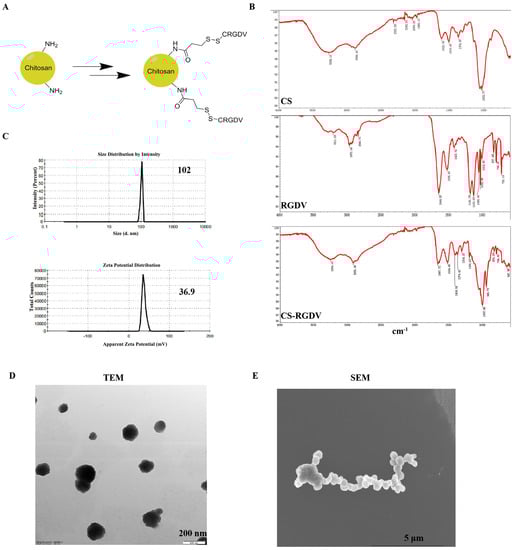 Characterization of chitosan-modified peptide nanoparticle. (A) Schematic illustration of the synthesis process of chitosan-modified peptide nanoparticles. (B) IR spectrum of RGDV peptide, chitosan (CS), and chitosan-modified peptide (CS-V). (C) Size distribution and zeta potential of CS-V. (D) TEM image of CS-V. (E) SEM image of CS-V.