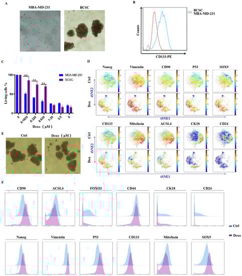 MDA-MB-231-derived spheroid cells were resistant to doxorubicin administration, and stem cell markers were dramatically induced. (A) Images of MDA-MB-231 cells and cultured spheroids. (B) Flow cytometry detected stemness marker CD133 expression of MDA-MB-231 cells and BCSCs. (C) CCK8 assay analysis showed anti-proliferation of doxorubicin against MDA-MB-231 cells and MDA-MB-231-derived spheroid cells. (D) t-SNE plot cluster distribution, and protein markers including CD133, CD90, vimentin, Nanog, Sox9, CK18, and CD24 expression of spheroid cells before and after being treated with doxorubicin (blue-to-red scale, red represents high expression). (E) Images of cultured stem cell spheres treated with or without doxorubicin. (F) Protein markers’ mean expression level of BCSCs treated with or without doxorubicin. (** p < 0.01, n = 3 biologically independent samples per group).