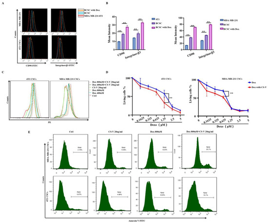 CS-V nanoparticles enhanced the activity of doxorubicin against BCSCs. (A) Flow cytometry results of the surface marker CD90 and integrin αvβ3 expression induced by doxorubicin in BCSCs derived from MDA-MB-231 and 4T1 cells. (B) Statistical analysis of CD90 and integrin αvβ3 expression induced by doxorubicin in BCSCs derived from MDA-MB-231 and 4T1 cells. (C) Flow cytometry analysis revealed that doxorubicin uptake was increased by CS-V nanoparticles. (D) Anti-proliferation activity of doxorubicin against BCSCs was enhanced by CS-V nanoparticles. (E) AnnexinV-FITC staining detected by flow cytometry revealed that apoptotic death induced by doxorubicin in BCSCs was enhanced by CS-V nanoparticles. (** p < 0.01, n = 3 biologically independent samples per group).