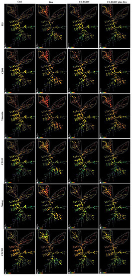 SPADE analysis (green-to-red scale, red represented high expression) showed stemness induced by doxorubicin was decreased in combination with CS-V nanoparticles. All the nodes in the figures represent a group of cells with similar protein expression patterns, and the size of the node represents the frequency of this group of cells.