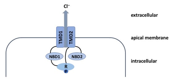 The CFTR protein is a 1480-amino acid glycoprotein belonging to the adenosine triphosphate (ATP)-binding cassette (ABC) transporter superfamily. Its architecture is complex and it allows the chloride (Cl−) ions to exit the epithelial cells (Figure 1).