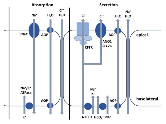 Schematic representation of ion transport in airway epithelia. Modified from Saint-Criq [12]. Epithelial tissues are made of one or more layers of cells that cover their surface and are joined to one another by junctional proteins. Epithelial cells are composed of two membranes with distinct functions depending on the tissue and on their ion channels, exchangers, cotransporters, or pumps. While the basolateral membrane is in contact with the interstitial tissue, the apical membrane is in contact with the external environment and thus also acts as a barrier to prevent potential pathogens or toxic compounds from reaching the bloodstream. Salt and water are absorbed or secreted via paracellular or transcellular pathways (respectively, ENaC and AQP). Cl− secretion across the epithelial cell apical membrane usually occurs via CFTR, depending on the CFTR channel opening and number, and creates the driving force for Na+ secretion across the epithelial cells through the paracellular pathway, with water following osmotically via aquaporins or the paracellular pathway [12]. Abbreviations: CFTR = cystic fibrosis transmembrane conductance regulator; ENaC = epithelial sodium channel; ANO1 = anoctamin-1; AQP = aquaporins; NKCC1 = Na-K-Cl cotransporter; Cl− = chloride; HCO3− = bicarbonate; H2O = water; K+ = potassium.