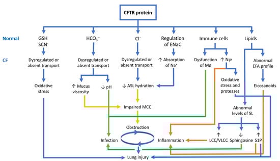 This Cl− channel function of the CFTR protein in the epithelial cell apical membrane of the lungs, upper respiratory tract, pancreas, liver, gallbladder, intestines, sweat glands, and reproductive tract is essential for the osmotic balance of the mucus and its viscosity. Owing to this widespread distribution of the CFTR protein, CF is a multisystem disease (Table 1), although lung involvement, characterized by bronchial obstruction, infection, and inflammation leading to bronchiectasis and progressive pulmonary injury, remains the main cause of morbidity and mortality [7,8]. The CFTR protein is thus commonly known as a Cl− channel expressed in the exocrine glands of several body systems where it also regulates other ion channels, particularly the epithelial sodium (Na+) channel (ENaC) that plays the central role in salt absorption. It also regulates the transport of bicarbonate (HCO3−), which was found to be largely involved in the pathophysiology of CF [9]. HCO3− plays a major role in airway surface liquid (ASL) pH homeostasis and therefore in the innate immunity system and mucus viscosity. The CFTR protein is also expressed by immune cells, the loss of functional CFTR in CF may result in dysregulation of their functions. In addition, the CFTR protein influences the metabolism of lipids that are the main component of cell membranes. In CF, eicosanoid synthesis through the arachidonic acid (AA) pathway plays a crucial role in inflammation. Therefore, the pathophysiology of CF is more challenging than a mere dysregulation of epithelial Cl− and Na+ transport in several body systems, mainly resulting in compromised mucociliary clearance (MCC) leading to pulmonary and pancreatic impairment. Indeed, these single gene mutations that compromise the CFTR function cause numerous metabolic changes, which explain the complexity of CF.