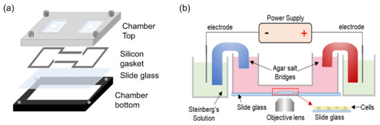 A customized agar-salt electrotaxis chamber with an incubator system was used to generate ES. Briefly, electrotaxis analysis was performed on a stage top incubator system using CCP ver. 3.8 software (Live Cell Instrument, Inc., Seoul, Korea), and equipped with an inverted microscope (Olympus Corporation, Tokyo, Japan). The electrotaxis chamber consisted of a chamber base on which a cell-seeded glass slide was placed, followed by a silicon gasket and finally the chamber top, connected by two 2% agar-salt bridges in Steinberg’s solution (Figure 1) [24]. Human ADSCs (Lonza, Basel, Switzerland) were cultured in ADSC growth medium (ADSC-GM, Lonza) at 37 °C in a 5% CO2 environment. Cells from passages 4–7 were used in all experiments. The ADSCs were seeded at a density of 1 × 104 cells/mL on a glass slide with a silicon O-ring of 6 mm inner diameter and incubated for 16–24 h in the CO2 incubator. The cell-seeded glass slide was placed on the chamber base, followed by the silicon gasket and chamber top placed over the slide. Thereafter, an electric current was applied through platinum electrodes immersed in reservoirs containing Steinberg’s solution, which were connected to the wells at each end of the chamber via 2% agar-salt bridges. The electrotaxis chambers containing the culture medium were exposed to constant ES at 1200 μA for 3 h or pulsed ES. During the experiment, electricity flow was measured using a digital power meter to ensure consistency of the electric current.