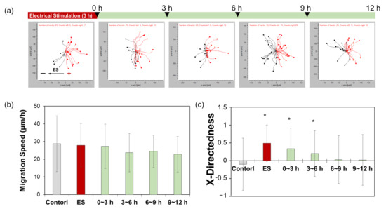 Migration assay of ADSCs subjected to single-round electrical stimulation (ES) for 3 h, followed by no stimulation. (a) Cell tracking data, (b) migration speed, and (c) X-directedness were determined for ADSCs subjected to 1200 μA ES for 3 h, followed by no ES for 12 h. * represents p < 0.05 compared to controls not exposed to electric current.