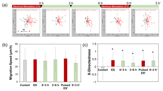 The application of a 1200 μA electric current for 3 h significantly increased the X-directedness of the cells in our study, whereby cells moved more directly toward the anode, indicating that these experimental conditions were sufficient to trigger electrotaxis. Moreover, directional cell migration was maintained for 6 h without any further exposure, following ES for 3 h. Based on these data, the ideal conditions for maintaining cell migration by pulsed ES were determined as 3 h stimulation followed by 6 h pause time.