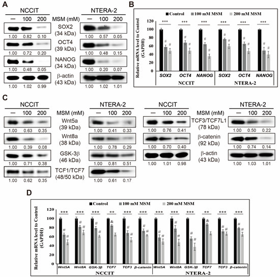 MSM inhibits CSC markers and Wnt/β-catenin signaling. (A) Western blotting of SOX2, OCT4, and NANOG proteins in NCCIT and NTERA-2 cells after treatment with 100 and 200 mM MSM for 48 h. Expression levels were estimated by densitometry and normalized to β-actin. Data were obtained in triplicate. (B) Real-time qPCR showing illustrative expression of SOX2, OCT4, and NANOG genes in NCCIT and NTERA-2 cells. Cp values were normalized to GAPDH mRNA. Controls were set at 100. *** p < 0.001 (ANOVA). # p < 0.001 vs. control. (C) Western blotting of Wnt5a, Wnt8A, GSK-3β, β-catenin, TCF1/TCF7, and TCF3/TCF7L1 proteins in NCCIT and NTERA-2 cells after treatment with 100 and 200 mM MSM for 48 h. Expression levels of proteins were estimated by densitometry and normalized to β-actin. Experiments were conducted in triplicate. (D) Real-time qPCR showing illustrative expression of Wnt5a, Wnt8A, GSK-3β, β-catenin, TCF7, and TCF3 genes in NCCIT and NTERA-2 cells. Cp values were normalized to GAPDH mRNA. Controls were set at 100. ** p < 0.01 (ANOVA). & p < 0.01 vs. control. *** p < 0.001 (ANOVA). # p < 0.001 vs. control.