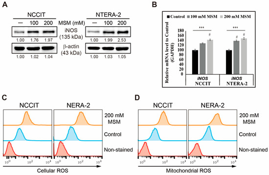 ROS induction in embryonic CSC by MSM. (A) Western blotting of NCCIT and NTERA-2 cells with 100 and 200 mM MSM for 48 h shows iNOS protein expression. Expression levels were estimated by densitometry and normalized to β-actin. Data were obtained in triplicate. (B) Real-time qPCR analysis showing illustrative expression of the iNOS gene in the NCCIT and NTERA-2 cells. Cp values were normalized to GAPDH mRNA. Controls were set at 100. *** p < 0.001 (ANOVA). # p < 0.001 vs. control. (C) Flow cytometry of cellular ROS in NCCIT and NTERA-2 cells after treatment with 200 mM MSM for 48 h. The graphical representation shows cells with ROS induction. (D) Flow cytometry of mitochondrial ROS by 200 mM MSM in NCCIT and NTERA-2 cells for 48 h. The graphical representation shows cells with mitochondrial ROS induction.