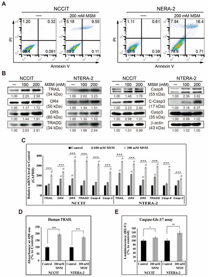 MSM induced extrinsic apoptosis pathway. (A) Fluorescein-conjugated annexin V (annexin V-FITC) vs. propidium iodide (PI) staining analysis showed apoptosis induction after treatment with 200 mM MSM for 48 h in NCCIT and NTERA-2 cells. (B) Western blotting of NCCIT and NTERA-2 cells with 100 and 200 mM MSM for 48 h showing the expression of TRAIL, DR4, DR5, TRADD, Casp8, Casp3, and C-Casp3 proteins. Expression levels were estimated by densitometry and normalized to β-actin. Data were in triplicate. (C) Real-time qPCR analysis showing illustrative expression of genes responsible for the extrinsic apoptosis pathway in NCCIT and NTERA-2 cells with 100 and 200 mM MSM for 48 h. Cp values were normalized to GAPDH mRNA. Controls were set at 100. *** p < 0.001 (ANOVA test). # p < 0.001 vs. control. (D) Human TRAIL assay shows Human TRAIL elevation by 200 mM MSM treatment for 48 h in NCCIT and NERA-2 cells. Controls were set to 100. *** p < 0.001 (Student’s t-test). (E) Caspase-Glo 3/7 assay showing the enhancement of caspase-3/7 activity by 200-mM MSM treatment for 48 h. Controls were set at 100. * p < 0.05 and ** p < 0.01 (Student’s t-test).