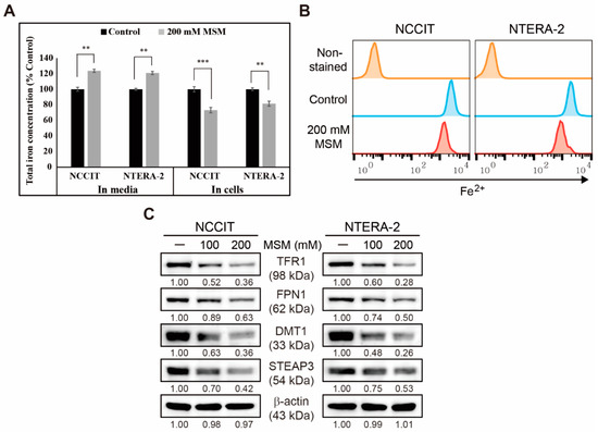 MSM suppressed iron metabolism. (A) Iron assay showing total iron concentration in NCCIT and NTERA-2 cells treated with MSM (200 mM) for 48 h. Data were obtained in triplicate. Controls were set at 100. ** p < 0.01 and *** p < 0.001 (Student’s t-test). (B) Flow cytometry showing the expression of Fe2+ in NCCIT and NTERA-2 cells after treatment with MSM (200 mM) for 48 h. The graphical representation shows cells with intracellular Fe2+ level. (C) Western blotting of TFR1, FPN1, DMT1, and STEAP3 in NCCIT and NTERA-2 cells after treatment with MSM (100 and 200 mM) for 48 h. Expression levels were estimated by densitometry and normalized to β-actin. Data were obtained in triplicate.