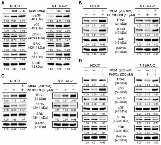 MSM regulated p38/ERK/p53 signaling and TRAIL expression. (A) Western blotting of NCCIT and NTERA-2 cells with 100 and 200 mM MSM for 48 h, showing the expression of phospho-p38, p38, phospho-ERK, ERK, and p53 proteins. Expression levels were estimated by densitometry and normalized to β-actin. Data were obtained in triplicate. (B) Western blotting of NCCIT and NTERA-2 cells with 10 µM SB 203580 or 200 mM MSM for 48 h, showing the expression of TRAIL, phospho-p38, and p38 proteins. Expression levels were estimated by densitometry and normalized to β-actin. Data were obtained in triplicate. (C) Western blotting of NCCIT and NTERA-2 cells with 50 µM PD 98,059 or 200 mM MSM for 48 h, showing the expression of TRAIL, phospho-ERK, and ERK proteins. Expression levels were estimated by densitometry and normalized to β-actin. Data were obtained in triplicate. (D) Western blotting of NCCIT and NTERA-2 cells with 200 µM FeSO4 or 200 mM MSM for 48 h, showing the expression of TRAIL, phospho-p38, p38, phospho-ERK, ERK, and p53 proteins. Expression levels were estimated by densitometry and normalized to β-actin. Data were obtained in triplicate.