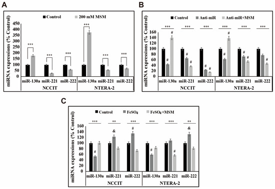 MSM regulated expressions of miR-130a, miR-221, and miR-222. (A) Real-time qPCR analysis of miR-130a, miR-221, and miR-222 expressions upon treatment with 200 mM MSM for 48 h in NCCIT and NTERA-2 cells. Representative expression of miR-130a, miR-221, and miR-222 mRNA were shown. Cp values were then normalized to U6 mRNA. Controls were set to 100. *** p < 0.001 (Student’s t-test). (B) Real-time qPCR of miR-130a, miR-221, and miR-222 expressions upon treatment with 60 pM anti-miR for 24 h, followed by 200 mM MSM for 48 h in NCCIT and NTERA-2 cells. The representative expression of miR-130a, miR-221, and miR-222 mRNA were shown; Cp values were then normalized to U6 mRNA. Controls were set to 100. *** p < 0.001 (ANOVA test). # p < 0.001 vs. control. (C) Real-time qPCR of miR-130a, miR-221, and miR-222 expressions upon treatment with 200 mM MSM for 48 h, followed by 200 µM FeSO4 for 48 h in NCCIT and NTERA-2 cells. The representative expressions of miR-130a, miR-221, and miR-222 mRNA are shown; Cp values were then normalized to U6 mRNA. Controls were set to 100. ** p < 0.01 and *** p < 0.001 (ANOVA test). & p < 0.01 vs. control. # p < 0.001 vs. control.