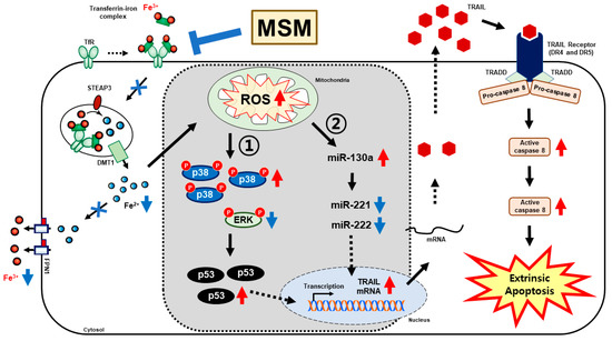 The molecular regulatory mechanism of MSM in the induction of TRAIL-mediated extrinsic apoptosis. MSM inhibited iron metabolism to generate ROS formation, regulating p38/ERK/p53 signaling to induce TRAIL expression. Moreover, MSM enhanced TRAIL expression by upregulating miR-130a and downregulating miR-221 and miR-222 expressions.