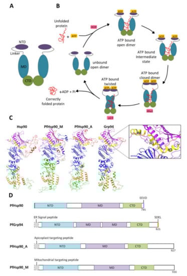 The nucleotide-dependent Hsp90 functional cycle and domain organization of P. falciparum Hsp90s. (A) Schematic of the general Hsp90 protein domain organization. (B) The Hsp90 functional cycle begins when Hsp90 is bound to ATP associate with an unfolded/partially folded client protein. Subsequently, the lid region closes over the ATP binding pocket, and the NTD dimerize, adopting a closed conformation. When the MDs associate, there is a repositioning of the catalytic loop in the MDs, which enables ATP hydrolysis. Upon ATP hydrolysis, the correctly folded client protein is released. The Hsp90 homodimer returns to the unbound open conformation and is primed for subsequent rounds of ATP hydrolysis and protein folding. This functional cycle is also modulated by co-chaperones such as HOP, Aha1, and p23. (C) Hsp90 protein models with the domains color codedthe NTDs are (purple), the linker (red), the MDs (blue), and the CTDs (green). The NTD helices H1, H4, and H5 are shown in yellow. Helices involved in dimerization are shown in orange. (D) The schematic of P. falciparum Hsp90 linear domain architecture for the differently localized Hsp90 proteins. Three-dimension (3-D) protein structures were generated by depositing protein sequences to the online PHYRE2 protein fold recognition server (http://www.sbg.bio.ic.ac.uk/phyre2/html/page.cgi?id=index, accessed on 18 April 2021). The 3-D model structures were visualized using the Schrodinger Maestro release 2021-3: LLC, New York, NY.