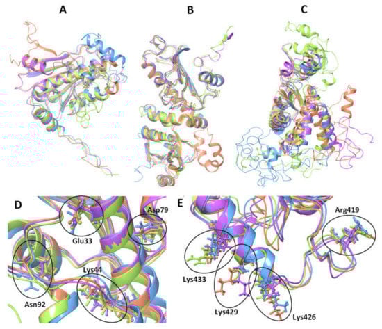 Superimposed domains and catalytic loop residues of the four parasite Hsp90 proteins. The 3-dimensional models of the four parasite Hsp90 proteins are superimposed to show catalytic residue structural conformation conservation. Catalytic residues of the other Hsp90 paralogs are thought to interact with the γ phosphate of ATP, enabling its hydrolysis. (A) The NTDs of the four parasite proteins. (B) The MDs of the four parasite proteins. (C) The CTDs of the four parasite proteins. The four parasite proteins superimposed cartoon zoomed-in for the (D) MD and (E) the NTD. The catalytic residues of PfHsp90 are labeled in (D,E). PfHsp90 is shown in purple, PfGrp94 in orange, PfHsp90_A in blue, and PfHsp90_M is shown in green. The non-conserved residues are in the MD of PfHsp90_M, which are Ser513, Asn516, and Arg520. Protein structures 3-D models were created by depositing amino acid sequences on the PHYRE2 protein fold recognition server (http://www.sbg.bio.ic.ac.uk/phyre2/html/page.cgi?id=index; accessed on 18 April 2021). The resultant 3-D protein structures were visualized and superimposed using the Schrödinger Maestro Release 2021-3: LLC, New York, NY.