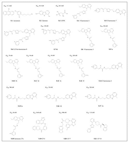 The chemical structure of Harmine and the derivatives. The inhibitors, 5.1 Acrisorcin. 5.2 Harmine. 5.3 2-amino-3-phospho propionic acid (APPA) were tested in in parsite growth inhibition studies. The 5.4 N-harmicines 6 and 5.5 O-harmicines 7. 5.6 N,O-bis-harmicines 8 and their derivative 5.7 8b. 5.8 N-harmicines 5 and its derivatives 5.9 5a, 5.10 5b, 5.11 5d, 5.12 5e and 5.13 5f. 5.14 O-harmicines 6 and its derivatives 5.15 6a, 5.16 6d and 5.17 6e. 5.18 Harmicine 27a. Other synthetic compounds 5.19 CP-6. 5.20 CP-7. 5.21 CP-10 were also developed. The respective IC50 values for parasite growth inhibition are shown.