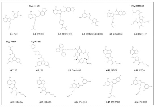 The purines and other derivatives as potential P. falciparum Hsp90 inhibitors. The chemical structures of the compounds are shown with their respective numbering. 6.1 PU3. 6.2 PU-H71. 6.3 MPC-3100. 6.4 CNF2024/BIIB021. 6.5 Debio0932. 6.6 Methyl 1-isopentyl-3-(2-methoxyacetamido)-5-((6-methylhept-5-en-2-yl)amino)-1H-pyrrolo[2,3-b]pyridine-2-carboxylate (IND31119). Two amino-alcohol-carbazole (N-CBZ) 6.7 5E and 6.8 5B. 6.9 Gamitrinib. 6.10 N-ethyl-carboximido adenosine (NECA) and its derivatives 6.11 N-propylcarboxamido adenosine (NPCA), 6.12 N-hydroxyethylcarboxamido adenosine (NEoCA) and 6.13 N-aminoethycarboxamido adenosine (NEaCA). Three purine derivatives 6.14 8-((2,4-Dimethylphenyl)thio)-3-(pent-4-yn-1-yl)-3H-purin-6-amine (PU-H54), 6.15 6-amino-8-[(3,5-dichlorophenyl)thio]-N-(1-methylethyl)-9H-purine-9-propanamine (PU-WS13) and 6.16 8-((2,4-Dichlorophenyl)thio)-9-(pent-4-yn-1-yl)-9H-purin-6-amine (PU-H39). Known parasite growth inhibition IC50 values are indicated. purine and derivatives, 7 a-azandole and amino-alcohol, carbazole derivatives with known parasite growth inhibition IC50 values, are indicated.