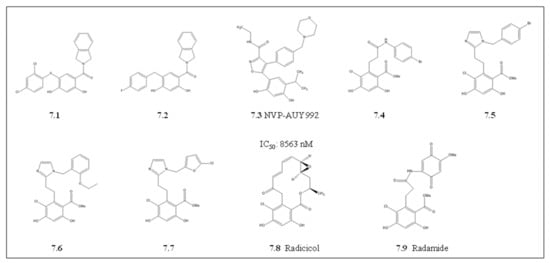 Derivatization of radicicol to generate Hsp90 paralog selective inhibitors yielded radamine and resorcyclic pyrazoles/isoxazoles. Radamide and the other derivative compounds 7.1, 7.2, 7.4, 7.5, 7.6 and 7.7 were selective for human HSPC4 [161,162]. The HSPC4 crystal structure in complex with radamide and compound 7.7 has been solved [113,162,163]. The structure elucidation revealed that for selectivity, these RA derivatives form hydrogen bonds with the carboxylate group of Asn107, Asp149, Lys168, and Thr245 of HSPC4 [162,163]. These residues line the Grp94 ATP binding pocket and occupy a unique small hydrophobic pocket that is not present in other Hsp90 paralogs [164]. It remains to be validated if parasite Grp94 can be specifically targeted as the RA derivatives binding residues are conserved in the parasite PfGrp94 and PfHsp90_A paralogs. This suggests that there are prospects for both radamine and compound 7.7 towards targeting parasite Grp94, which may result in antiplasmodial activity. Preliminary studies identified NVP-AUY922, also known as luminespib (Figure 7), a resorcinylic isoxazole amine that binds and inhibits Hsp90 with a higher affinity than radamide [165]. The binding affinity for luminesbip to PfGrp94 was 10-fold higher compared to the cytosolic PfHsp90 and HSPC2 [81]. Despite having promising selectivity against PfGrp94, the similar high binding affinities with both PfHsp90 and HSPC2 limited its prospects in the current form. Nevertheless, this creates more opportunities for further derivatization to develop selective inhibitors against parasite Hsp90s.