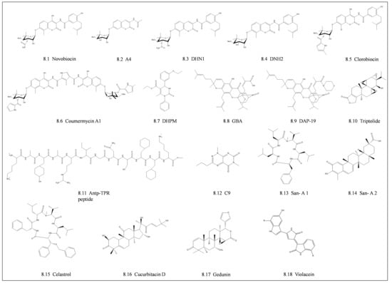 The chemical structure of inhibitors targeting the Hsp90 middle and C-terminal domains. The structures of compounds that target the NTD and CTD of Hsp90 and also abrogate co-chaperone interactions are shown. Inhibitors of the coumermycin family 8.1 Novobiocin and its derivatives 8.2 A4, 8.3 4-deshydroxynovobiocin (DHN1) and 8.4 3′-descarbamoyl-4-deshydroxynovobiocin (DHN2). Additional members of the coumermycin family 8.5 Clorobiocin and 8.6 Coumermycin A1 derivative. 8.7 3,4-dihydropyrimidin-2(1H)-one (DHPM). A natural product 8.8 Gambogic acid (GBA) and its derivative 8.9 DAP-19. A diterpene triepozide 8.10 Triptolide (TL). A peptidomimetic compound 8.11 Antp-TPR peptide. A small molecule compound 8.12 1,6-dimethyl-1-3-propylpyrimido(5,4-e)(1,2,4)triazine-5,7-dione (C9). Sansalvamide A compounds 8.13 San-A1 and 8.14 San-A2. Additional co-chaperone inhibitors 8.15 Celastrol, 8.16 Cucurbitacin D and 8.17 Gedunin. 8.18 Violacein.