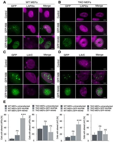 By direct fluorescence, we found that, in both WT and TKO MEFs, GFP-NHA9 localized to the nucleoplasm in a punctate pattern (Figure 1A) as previously described by us and others [2,4,22,51]. GFP-N98 on the other hand localized to the nuclear rim in a punctuated pattern typical for nucleoporins, to the nucleoplasm, and in nuclear foci (Figure 1A). We at the same time examined the fate of the LAP2α in the GFP-NHA9 and GFP-N98 expressing MEFs by immunofluorescence microscopy. As shown in Figure 1A,B, the LAP2α signal was significantly reduced in WT MEFs expressing GFP-NHA9, but not in TKO MEFs.