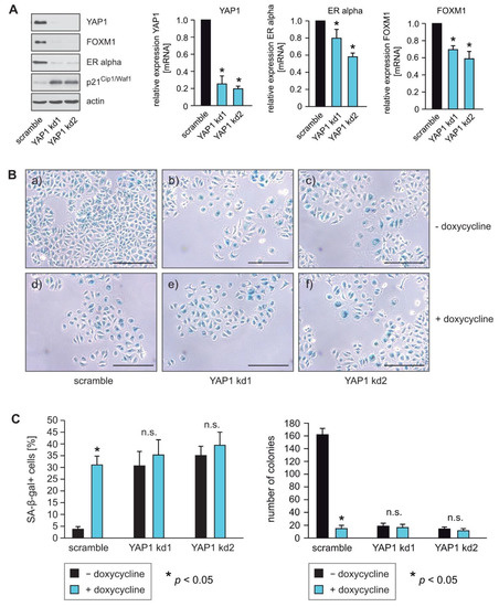 The knockdown of YAP1 reduced colony formation and increased the number of senescent cells in comparison to scramble control counterparts (Figure 2B,C). These data suggest that YAP1 is important for the survival and proliferation of ERα-expressing breast cancer cells, and that aberrations in the Hippo pathway that lead to increased YAP1 activity are likely to foster breast cancer initiation and progression. Furthermore, the knockdown of YAP1 led to increased expression of the cell cycle inhibitor p21Cip1/Waf1 (Figure 2A). These findings are in accordance with recently reported findings that pharmacological inhibition of YAP1 or YAP1 depletion led to increased expression of p21 and the induction of senescence [39].