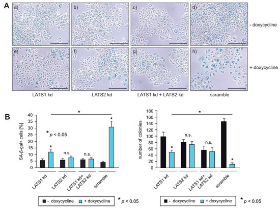 Knockdown of LATS1 and LATS2 circumvent RASSF1A-mediated induction of senescence. (A,B) RASSF1A-induced senescence in conditional RASSF1A MCF7 scramble, LATS1 kd, LATS2 kd and LATS1+LATS2 double knockdown cells was monitored by SA-β-gal staining (right panel). Cells were cultured in the absence (a–d) or presence of 1 µg/mL doxycycline (e–h) as indicated. Bars = 100 µm. (B) Quantification of senescent cells was achieved by counting (left panel). Mean values ± s.d. of three independent experiments are shown. p-Values < 0.05 are indicated by asterisks. Quantification of colonies was achieved by counting (left panel). Mean values ± s.d. of four independent experiments are presented. p-Values < 0.05 are indicated by asterisks.