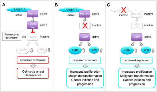 - Roßwag, S.; Thiede, G.; Sleeman, J.P.; Thaler, S. RASSF1A Suppresses estrogen-dependent breast cancer cell growth through Inhibition of the yes-associated protein 1 (YAP1), Inhibition of the forkhead box protein M1 (FOXM1), and activation of forkhead box transcription factor 3A (FOXO3A). Cancers 2020, 12, 2689. [Google Scholar] [CrossRef]